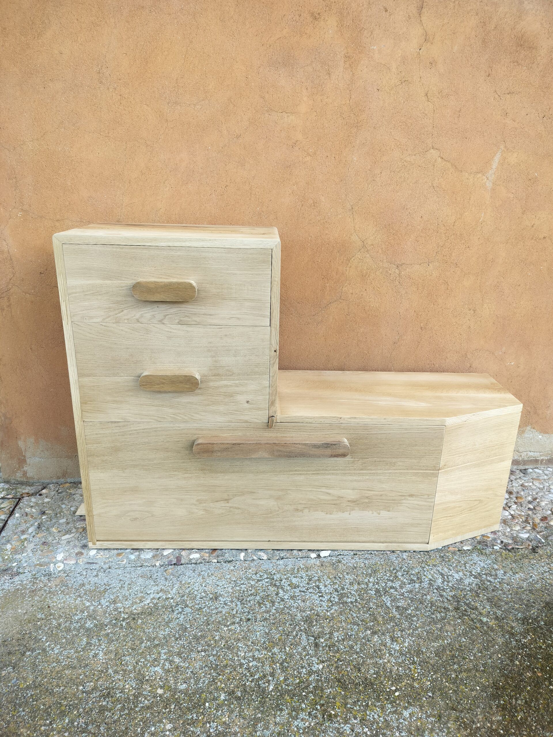 Mueble de entrada con juntas tradicionales. Es un mueble pensado para la entrada a la vivienda, por lo que tiene que tener carácter y consistencia. Todas las juntas las realizamos siempre a mano y con el mayor de nuestros cuidados.