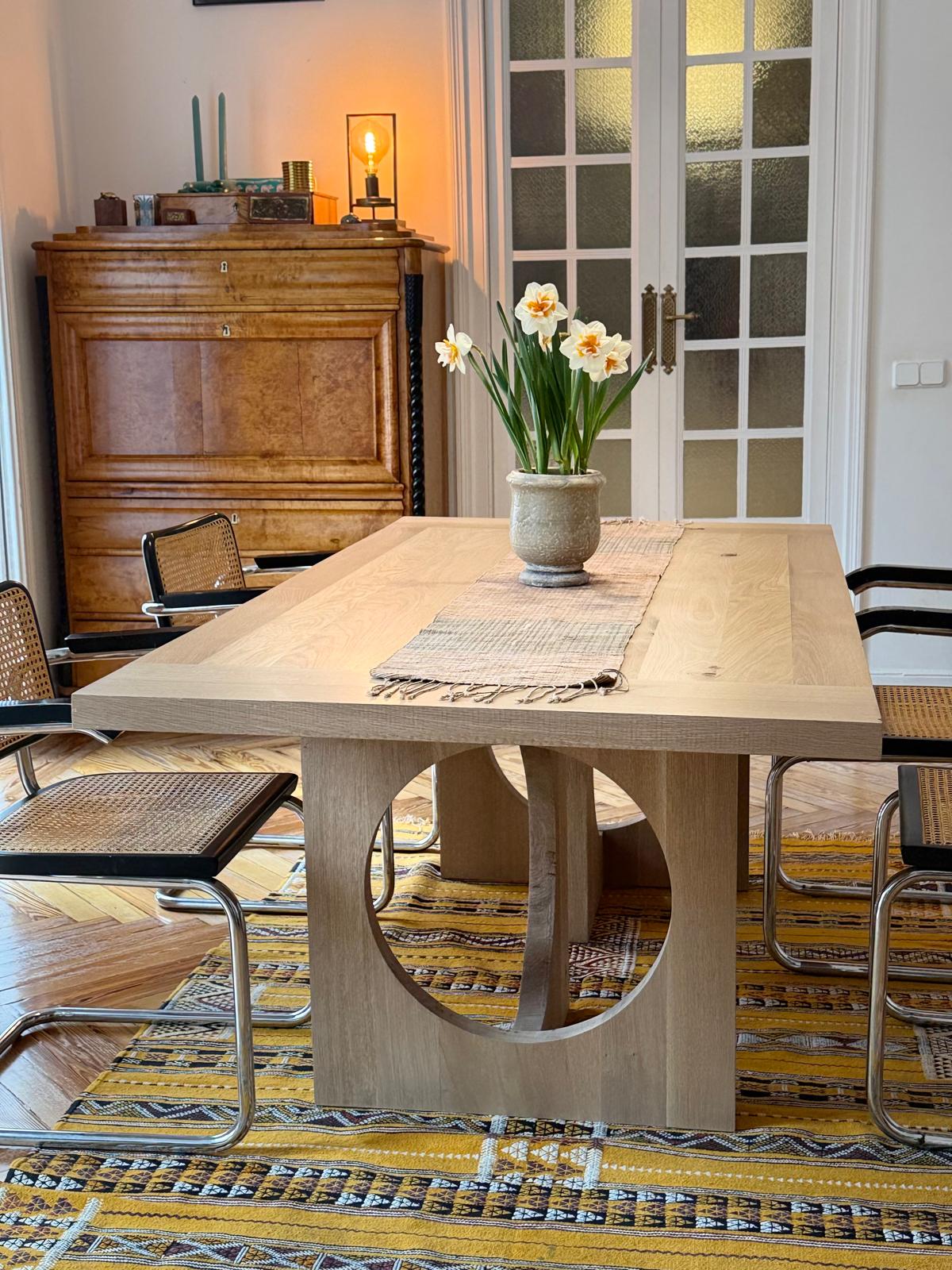 Es una mesa sencilla, robusta y pensada para durar, hecha con materiales nobles y un proceso de construcción cuidado.