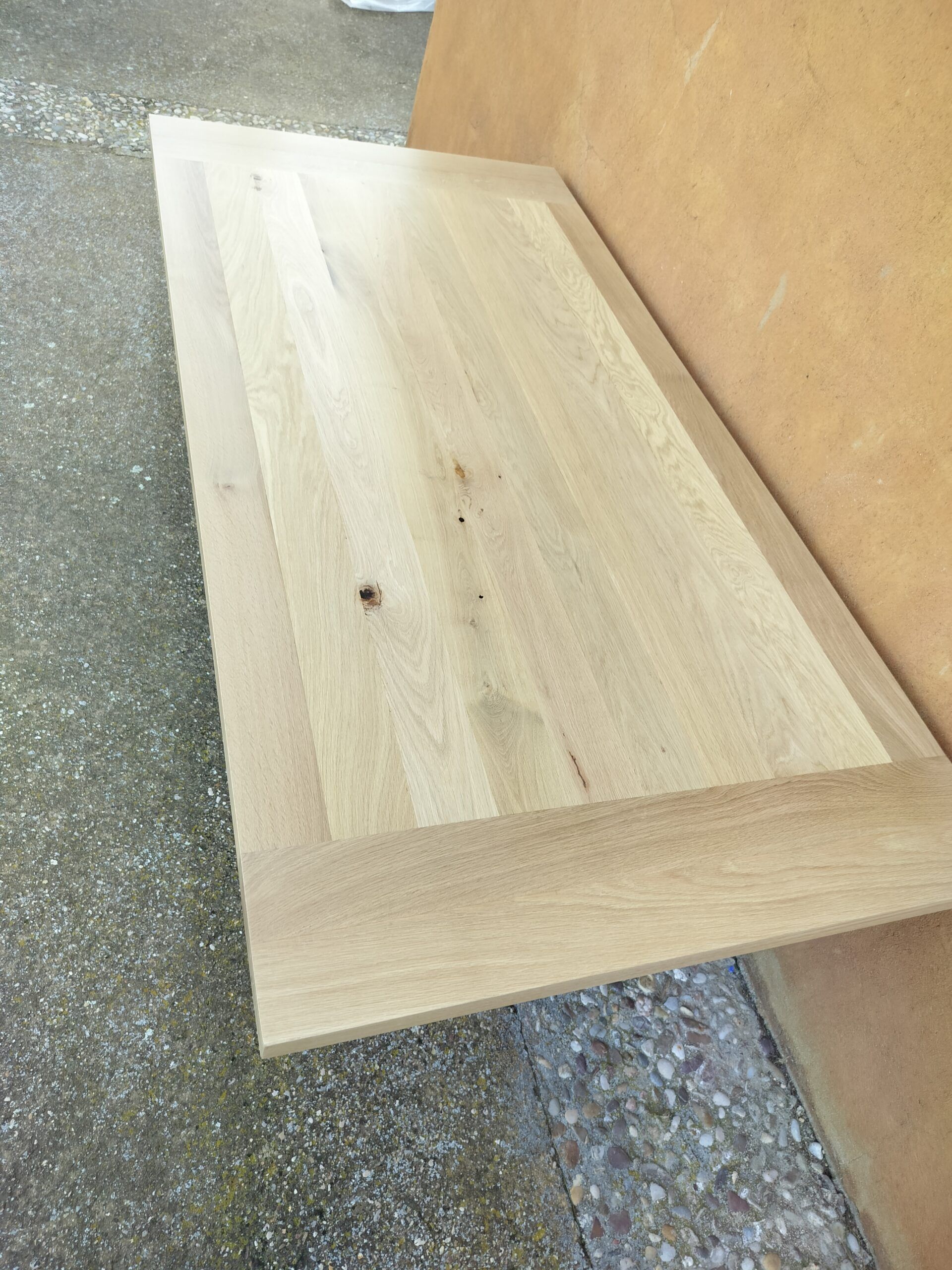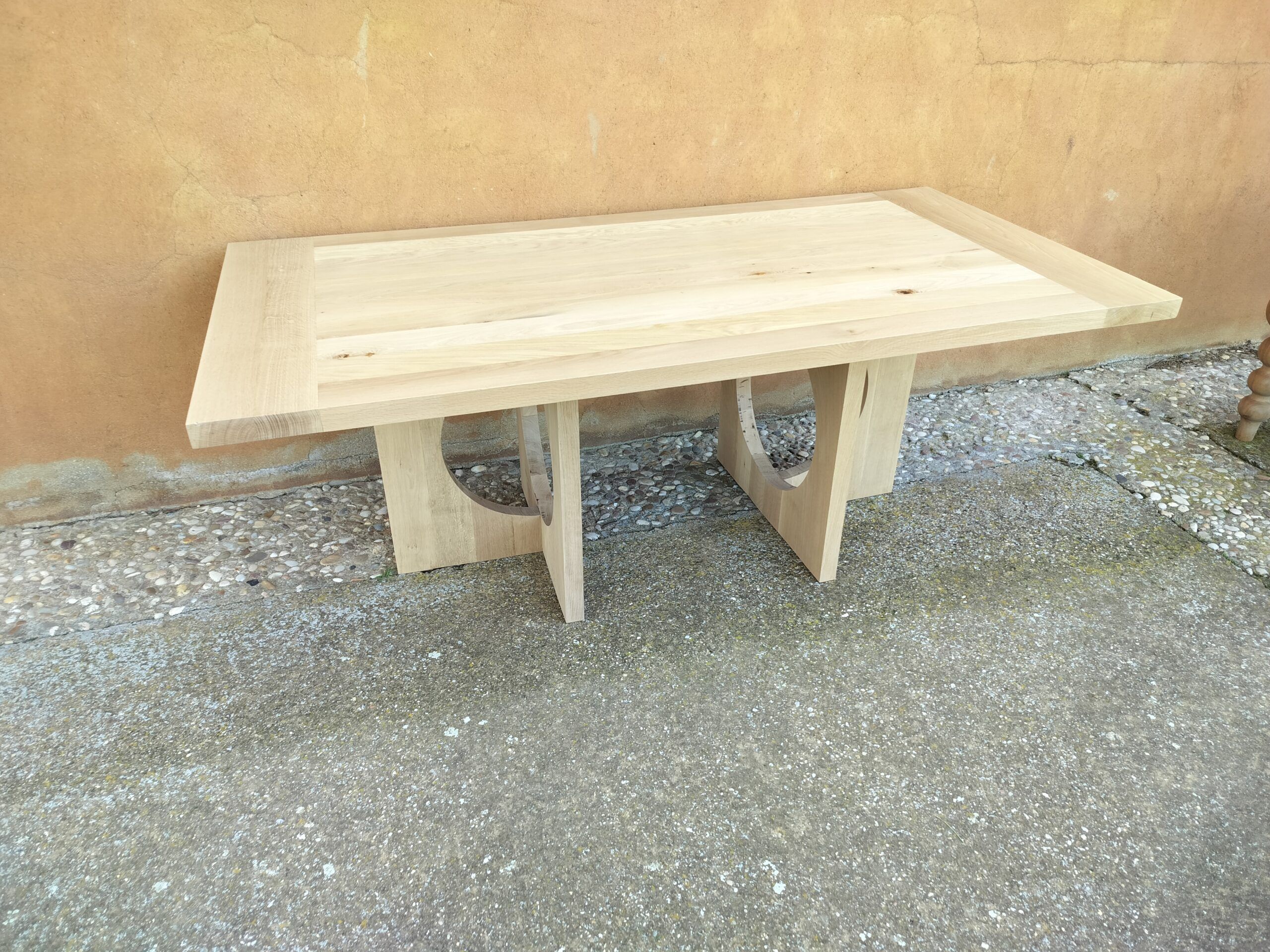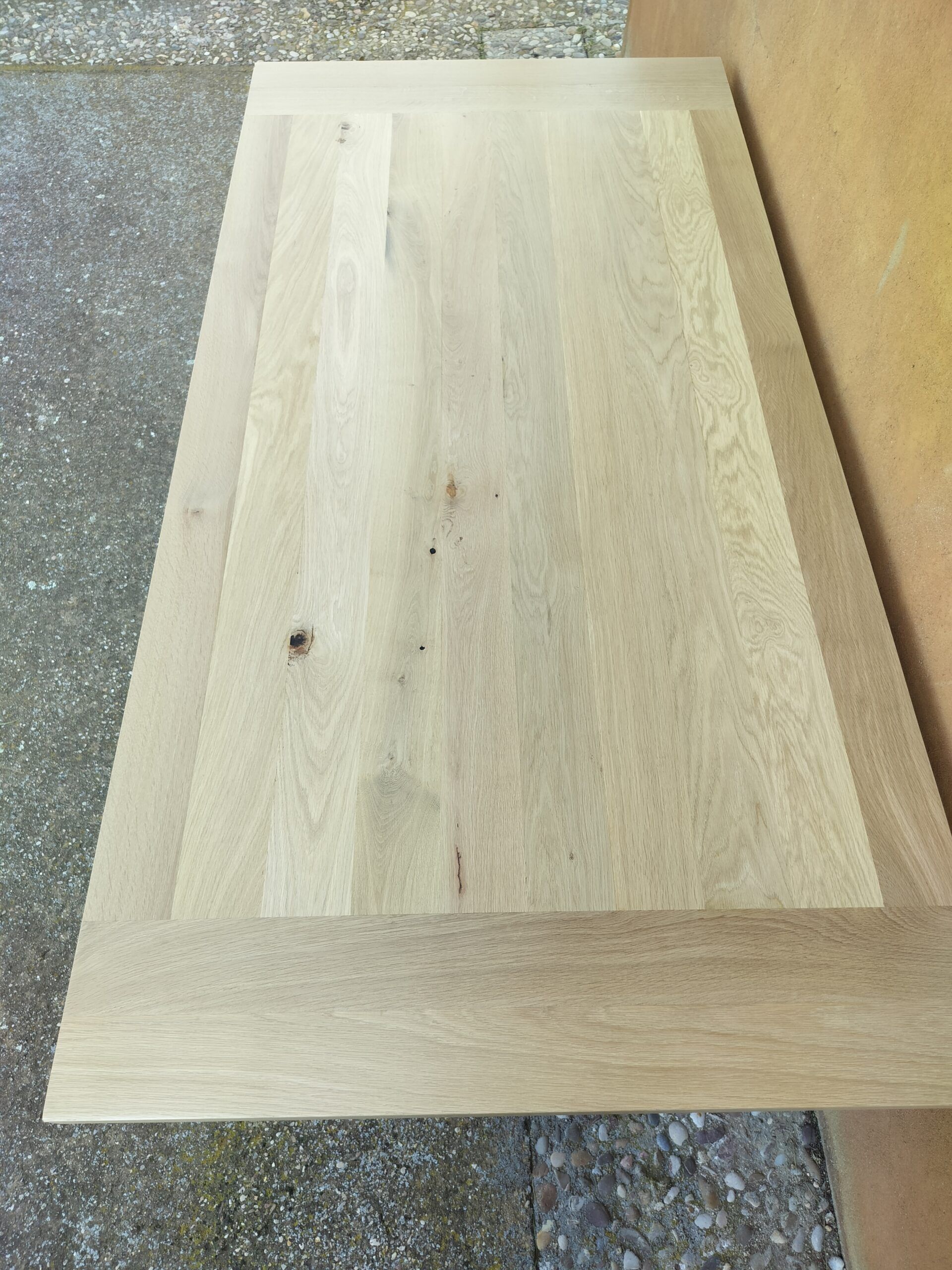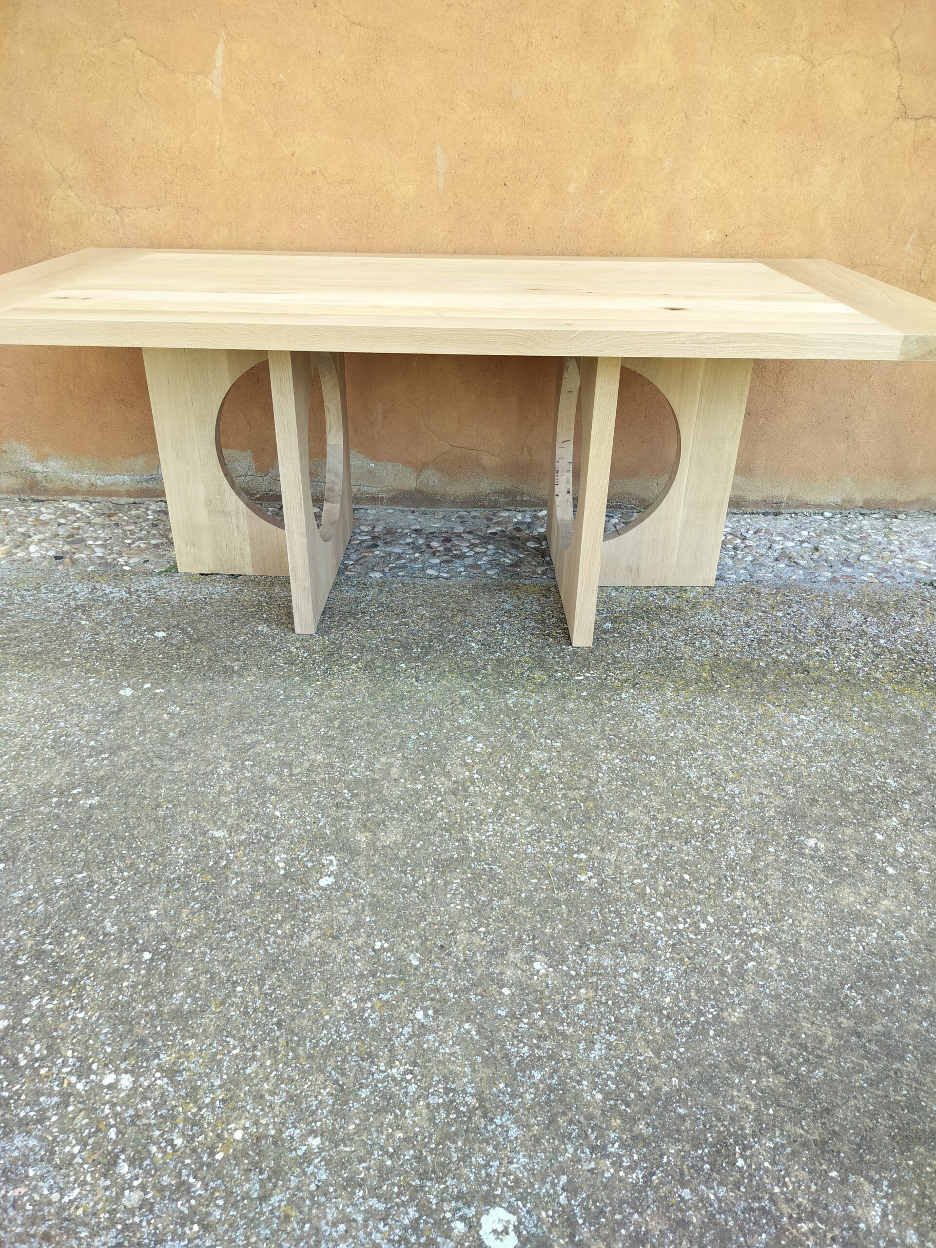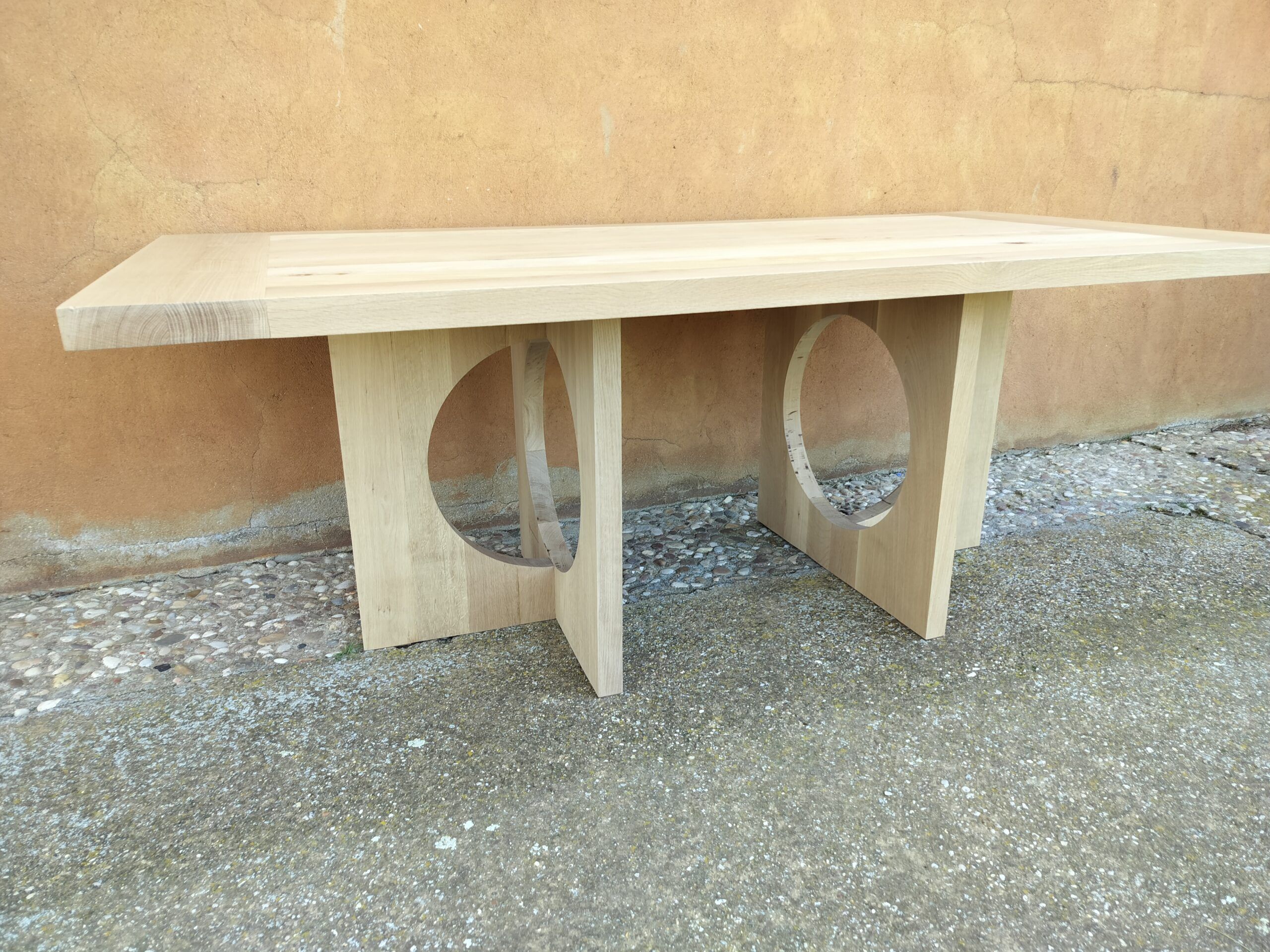 La mesa está hecha en madera de roble, una de las maderas más valoradas en carpintería por su dureza y resistencia. Es una madera fuerte, estable y muy duradera, con una veta bien definida y tonos que van del beige claro al marrón miel. Soporta muy bien el uso cotidiano, los golpes y el paso del tiempo, manteniendo su estructura y carácter.